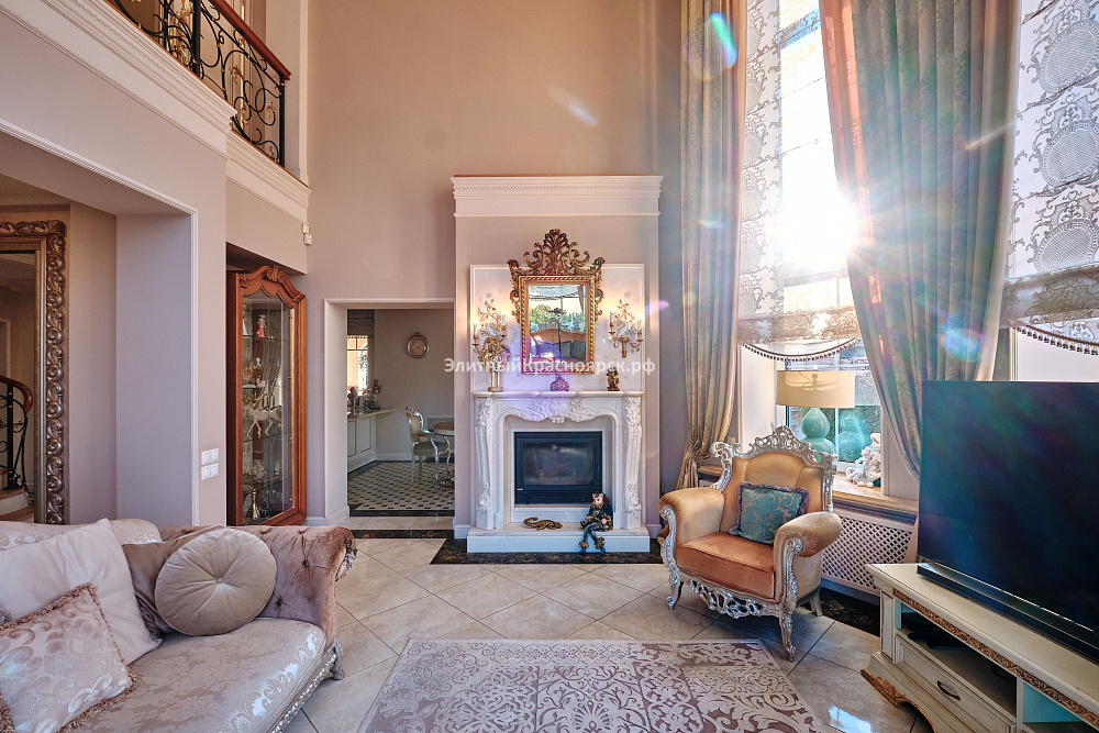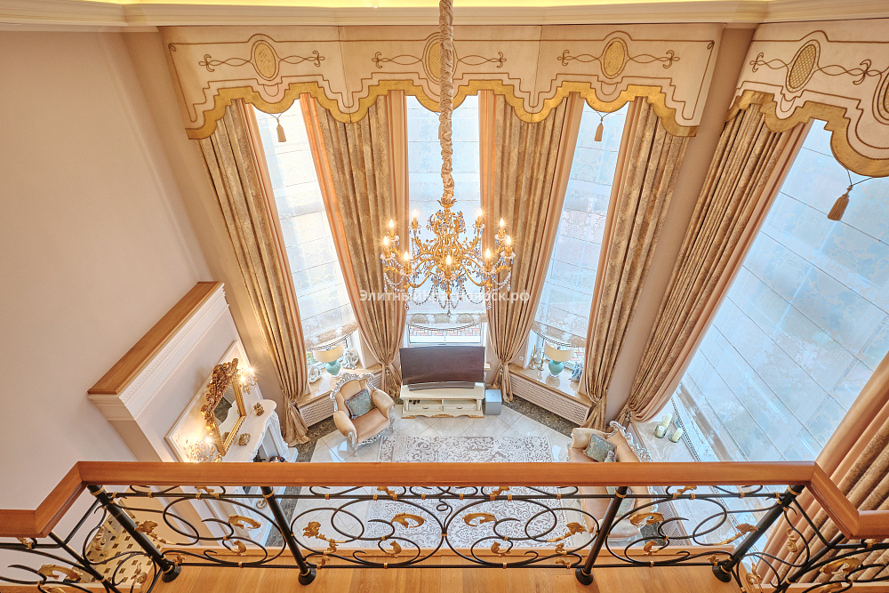 - Просторная гостиная с «вторым светом» и панорамными окнами. Высота потолка 6.5 метра!