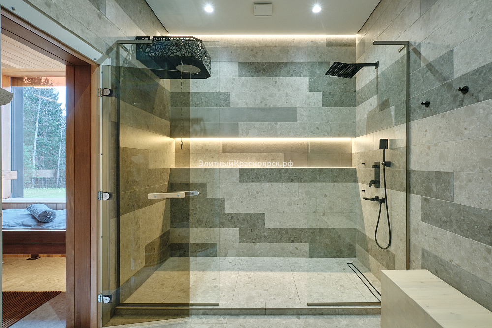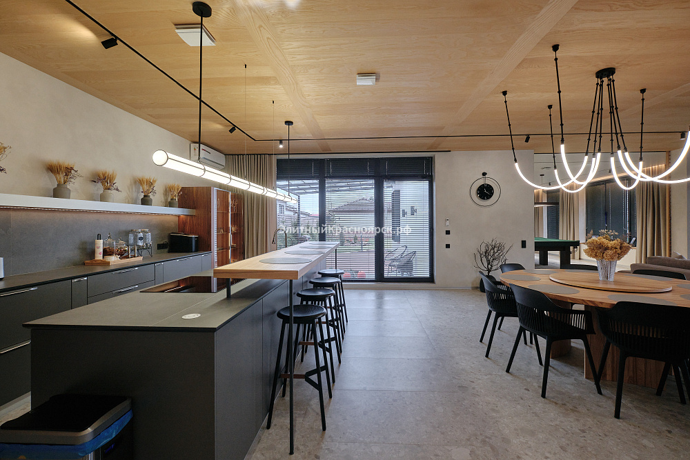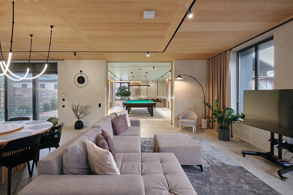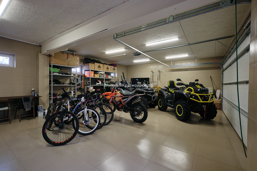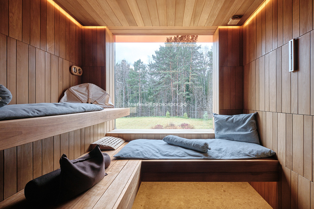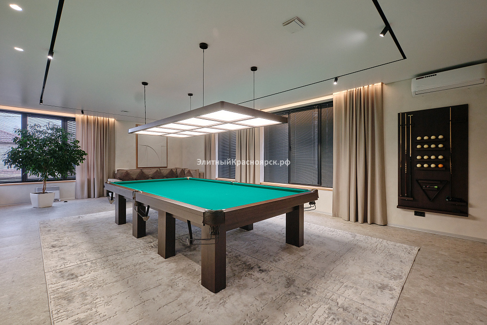- Во втором здании находится шикарная баня на дровах с панорамными окнами, большая гостиная, в которой можно расположить гостей, бильярдная и выход к зоне барбекю. Также на участке построены два гаража, каждый из которых вмещает по несколько автомобилей и технику для отдыха.