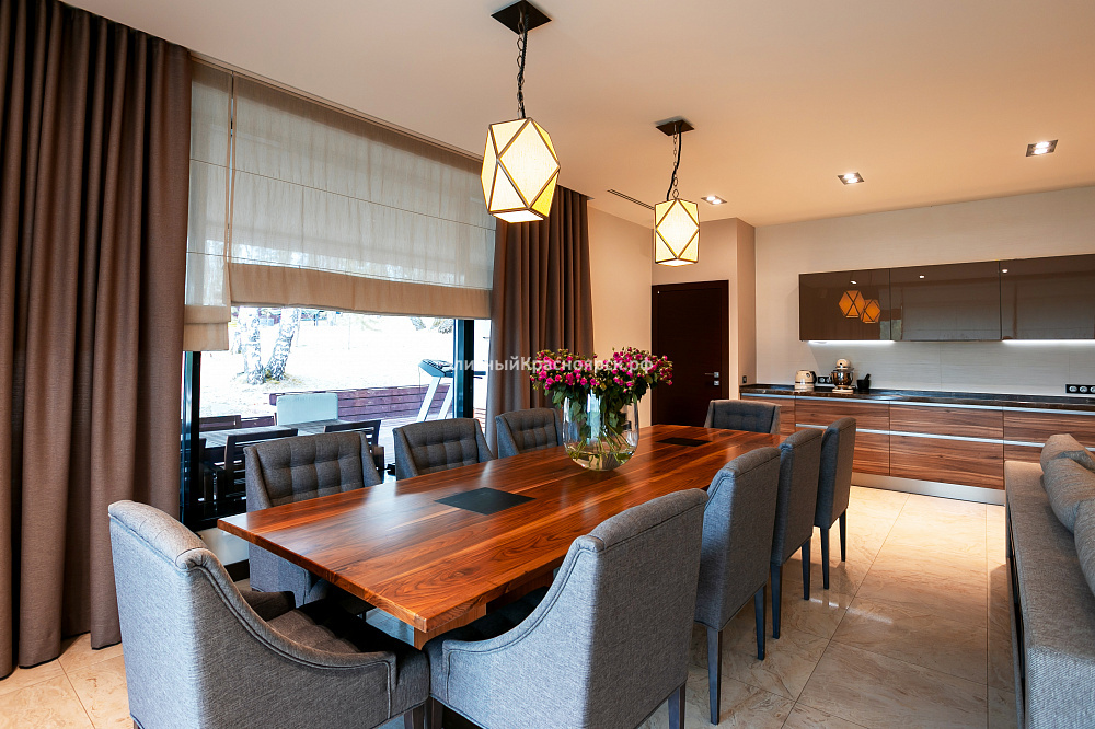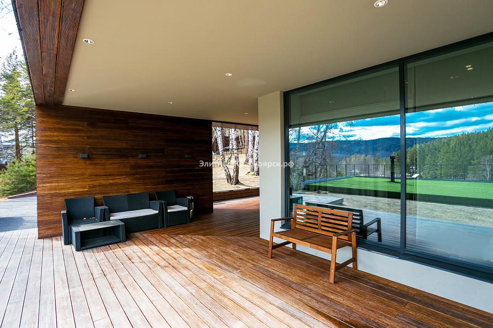 Это не просто стандартный хороший дом – это современное жильё в стиле Hi-tech. С чёткой геометрической формой, большой площадью застекленного пространства, со свободными планировками в проекте, несмотря на одноуровневость здания. Максимально функциональный и эргономичный. Полностью автономный и независимый от общих сетей. Это воплощенный в жизнь «дом будущего». Продаётся мегасовременный коттедж, расположенный в лесном массиве около пионерского лагеря «Бирюсинка» (примерно в 3-х км. от Плодово-ягодной станции). Масштабный земельный участок 48 соток – в собственности и гектар леса – в аренде. Дом – в один этаж. Но какой это этаж! Площадь 330 квадратов. Огромная светлая гостиная с камином, совмещенная с полностью обустроенной по последнему слову технике кухней. Выделена столовая зона. Есть прямой выход на террасу. Большая площадь остекления. Панорамные окна в пол открывают широкоформатный вид на участок и лес. Родительская мастер-спальня с собственным гардеробом и санузлом. Кабинет. Две дополнительные спальни с отдельным санузлом. Качественная итальянская мебель. Вся техника известного немецкого бренда «Miele», включая разнообразные «посудомойки», «сушилки», «стиралки» – всё, что только существует в природе. Мощная акустическая система. Дом полностью автономен. В наличии собственная подстанция. На случай отключения света предусмотрен генератор на 100 кВт. Артезианская скважина глубиной 120 метров. Отапливается электричеством (водяное отопление). Тёплый пол. Кондиционеры и приточно-вытяжная установка «Daikin». Прилегающий участок обширнейший. Здесь расположен шикарный банный комплекс, который по-другому как произведение искусства и не назвать. С парилкой, комнатой отдыха, санузлом и обустроенной зоной барбекю. Открытый летний бассейн размером 15 х 6 метров. Гараж на три автомобиля. Территория окружена забором и находится под охраной. Выполнен ландшафтный дизайн. Перед домом наировнейший газон. Растут сосны и берёзки. Дорожки выложены брусчаткой. Вокруг царит атмосфера ухоженности и красоты. Коттедж расположен в тихом, спокойном месте – в экологически благоприятном районе. Однородная коттеджная застройка. Рядом лес. Пожалуй, для этого дома определение «коттедж» – слишком узко. Его смело можно назвать комфортабельной современной виллой.