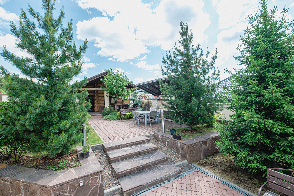 * на участке растут хвойные и фруктовые деревья, декоративные кустарники, цветы, высажен огород.