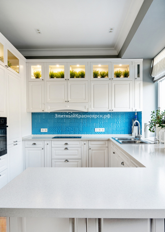 Особого внимания заслуживает кухня-гостиная. Необычное решение в виде подсвечиваемых растений по периметру гарнитура определенно добавляют уюта этой зоне. На кухне есть вся необходимая техника. Также большая рабочая поверхность соединенная с островом. Можно выпить кофе или позавтракать наслаждаясь видом из окна. В гостиной с эркером удобнейший диван и обеденный стол.