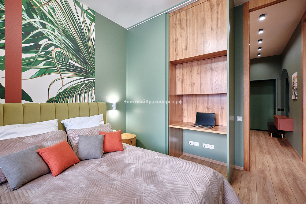 Уютная спальня создает атмосферу летнего отпуска круглый год в любую погоду. Скрытое рабочее место позволяет максимально эффективно использовать пространство.