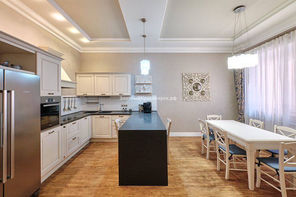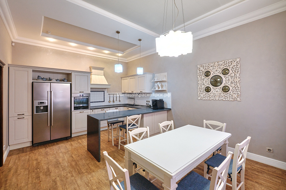 · Сердце дома: огромная кухня-гостиная с высокими потолками, создающими ощущение простора и свободы. Мощная аудиосистема наполнит это идеальное пространство для приёмов безупречным звуком.