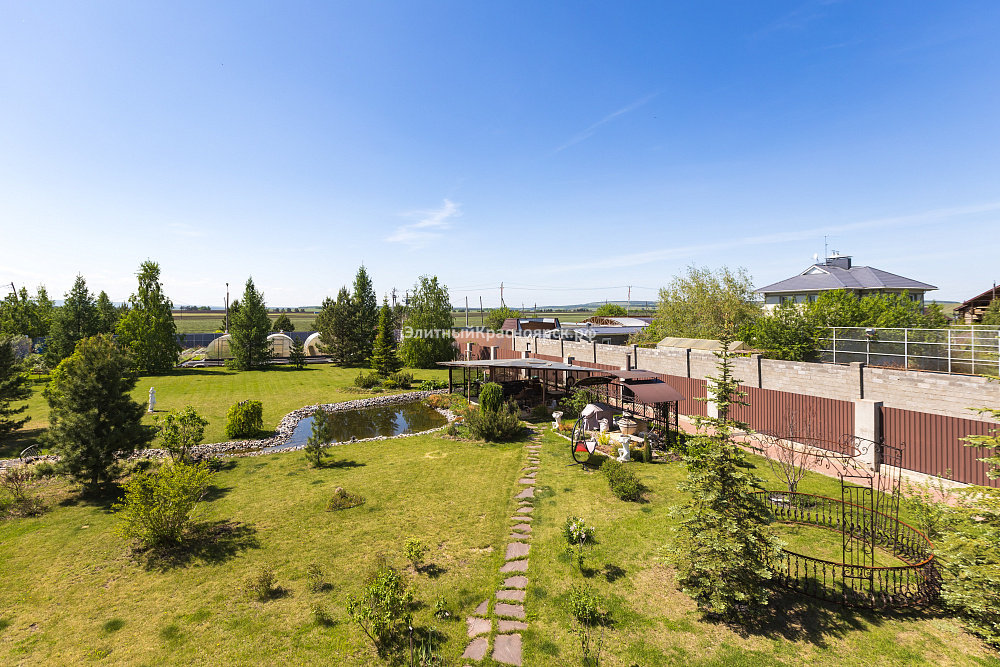 Участок радует глаз ландшафтным дизайном, множеством деревьев, уютной беседкой с мангальной зоной и озером, в котором живут карпы.