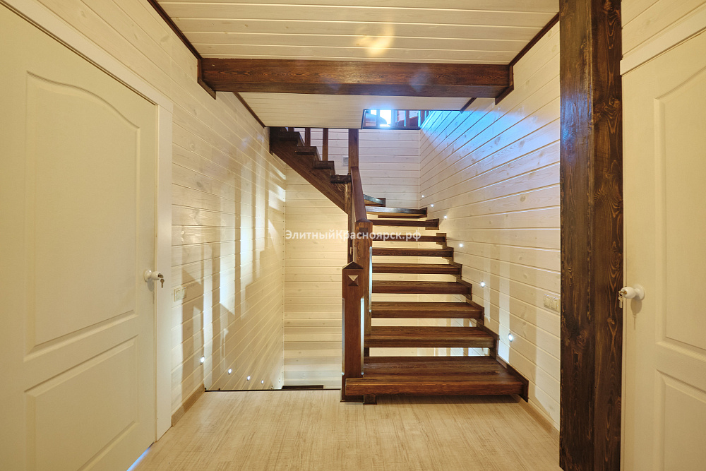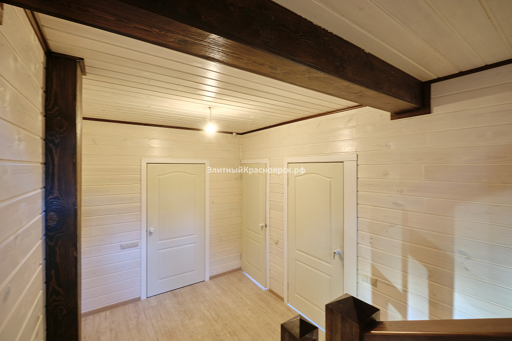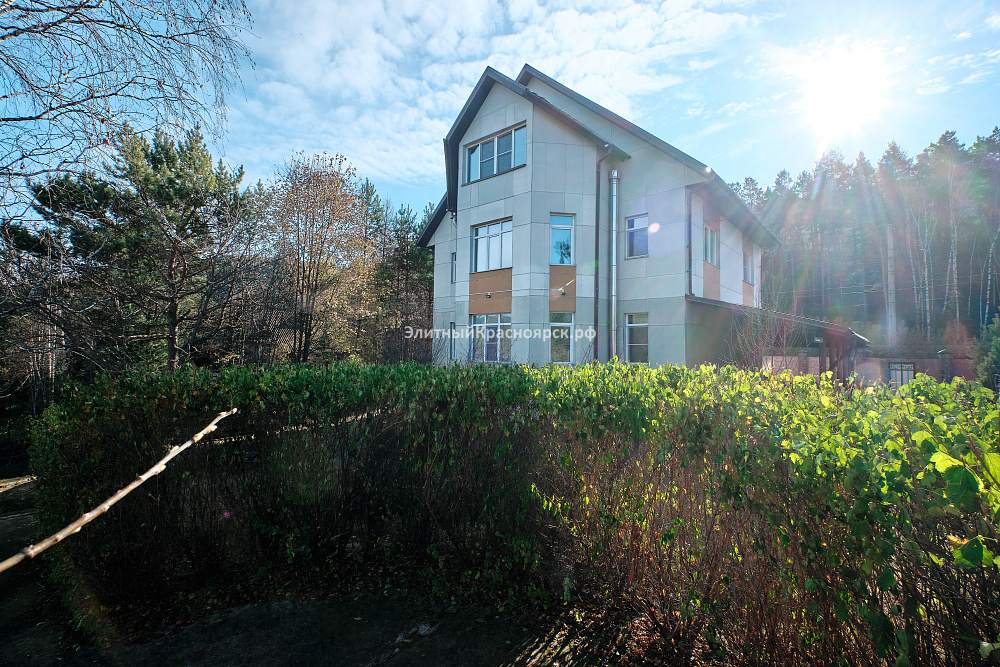 Трёхэтажный брусовой дом площадью 376 м² расположен прямо на берегу Енисея — из всех окон открываются живописные панорамы на реку.