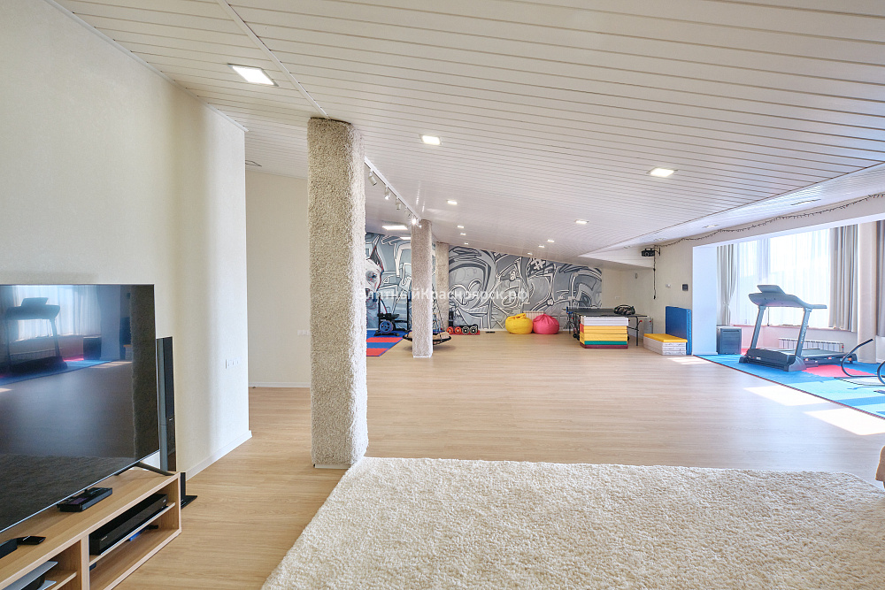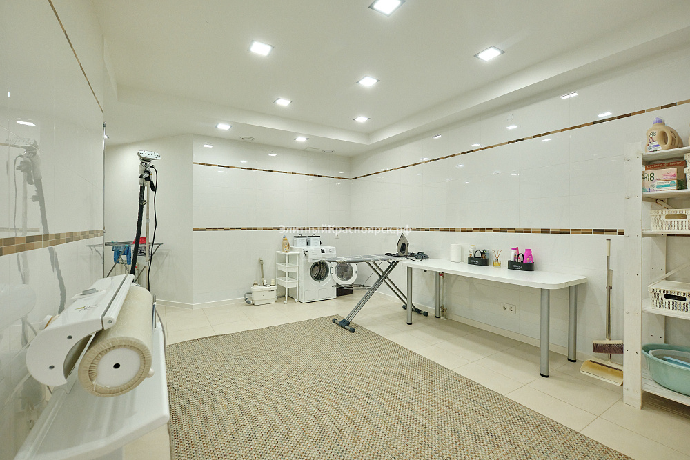 1 этаж: прихожая с гардеробной комнатой, кухня с кладовой, обставленная функциональной мебелью, укомплектованная техникой Miele, столовая с панорамными окнами, гостиная с камином, кабинет, гостевой санузел. 2 этаж: родительская мастер-спальня, две детских спальни со своим санузлом. 3 этаж: гостевая спальня с санузлом, спортзал, кинотеатр. 0 этаж: котельная, аккуратно оформленная, где расположены все необходимые коммуникации для отопления и водоснабжения, лондри, где установлены стиральная, сушильная и гладильная машины, сезонная гардеробная. Из цоколя выход на подземную парковку.
