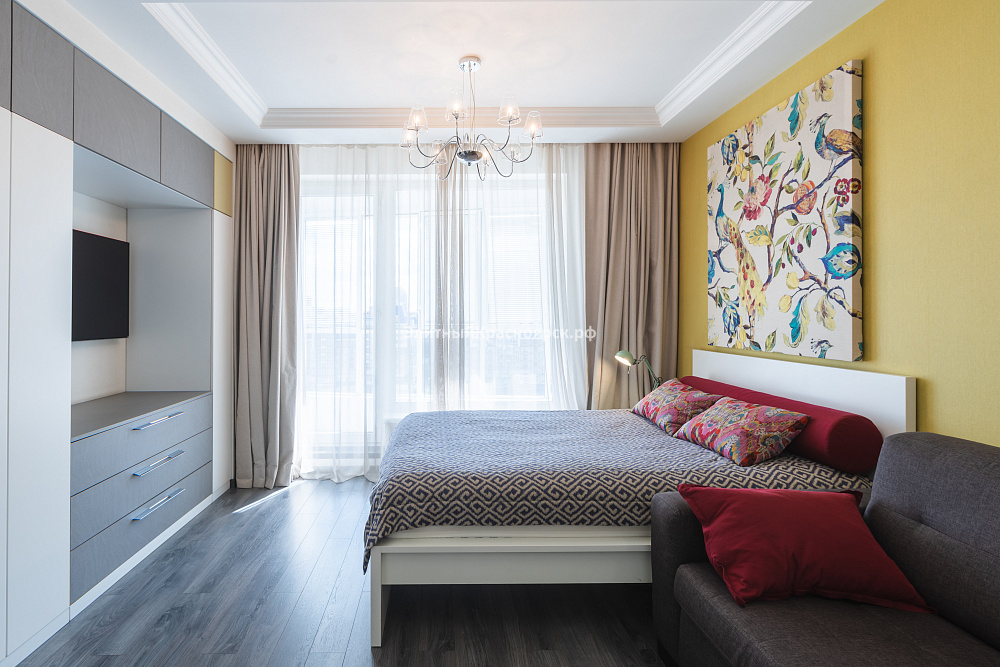 - просторная гостиная с двумя окнами дает возможность, при необходимости, обустроить еще одну спальню;